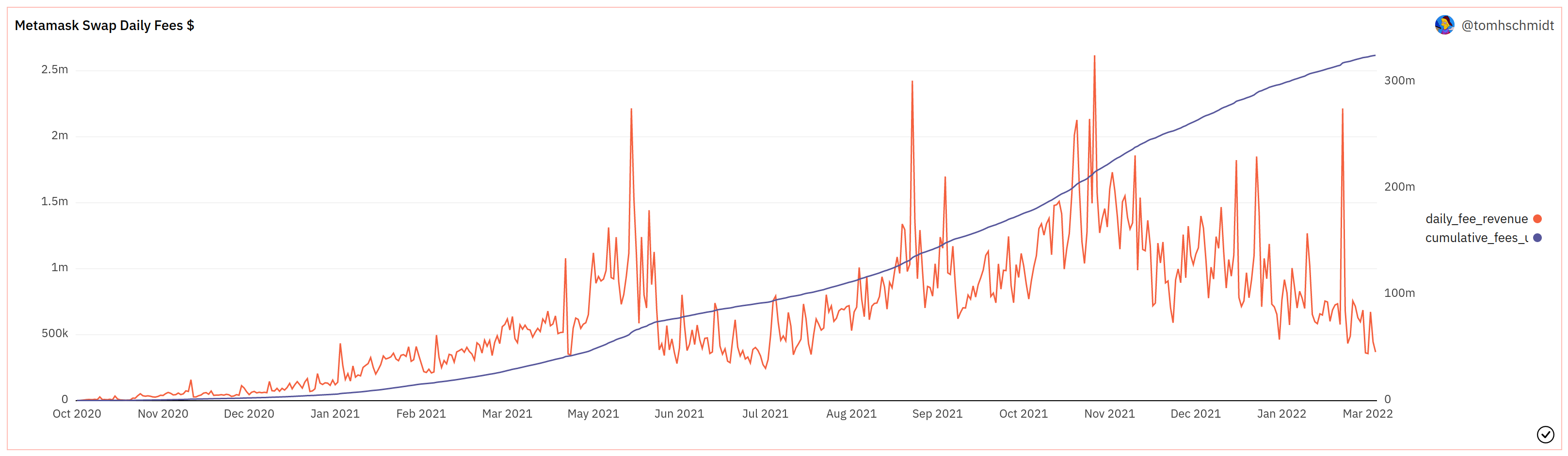 While no one was looking, Metamask just started fucking printing. Making ~$170K / day in fees at $20MM / day in volume. pic.twitter.com/hoFhSS84Pk