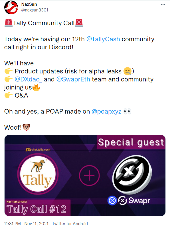 The Tally Ho community call on November 12 was the biggest call that we’ve hosted so far, with 634 unique attendees. In addition to the POAP badges for attendance, the moderation team also raffled 5 limited edition animated POAP using content from community member Naive. The winners were also granted the OG role. If you’re a regular on the calls, you know we like to drop treats! If that’s news to you, we’ll see you on our next call November 19 at 2PM EST.