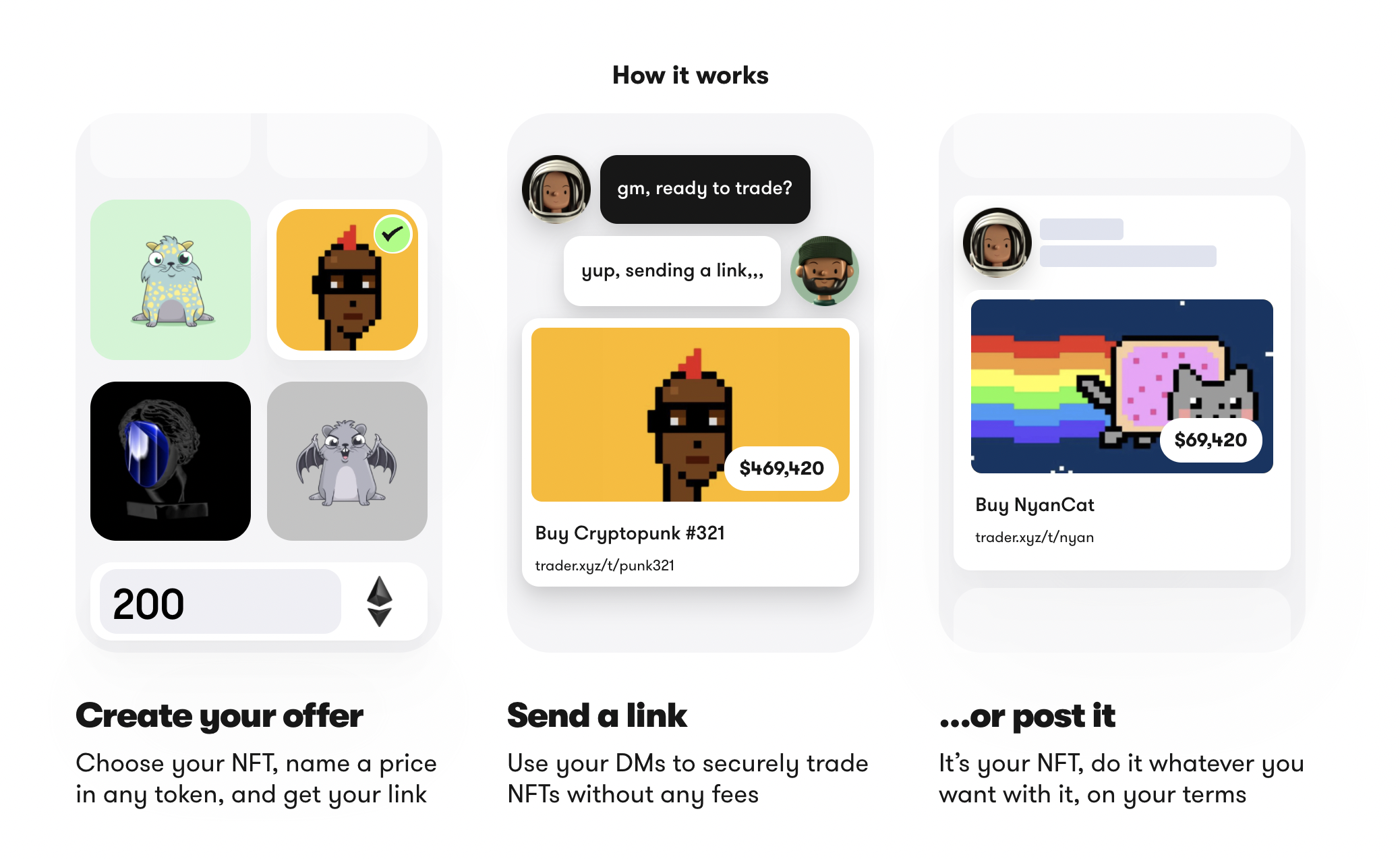 trader.xyz is built on 0x protocol and is simple to use. Just create an offer, get a customized link, and then you're ready to share! You can also swap and sell in bundles.