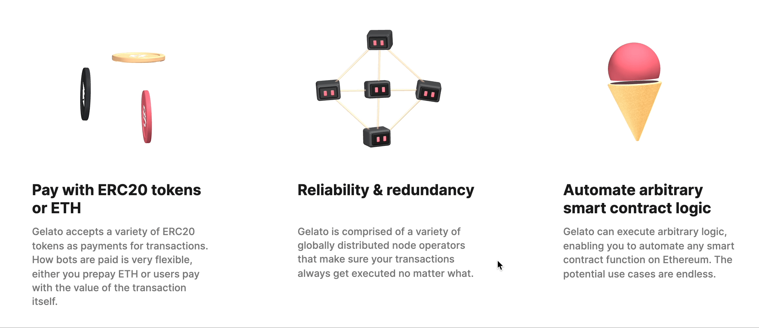 Developer teams regularly have to pay hefty prices in order to outsource these bot operations. Gelato provides a decentralized network of plug-and-play bots, saving time and money for developers.
