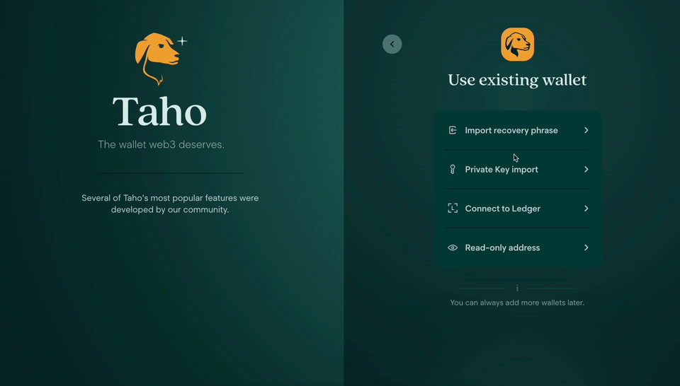 The ability to import and export your private keys inside Taho securely and with ease allows you to take full control of your crypto holdings without relying on third-party services and exchanges. We’re committed to empowering you to take ownership of your wallet; this feature is another step forward in that mission by providing further security optionality, access, and flexibility to meet your unique needs.