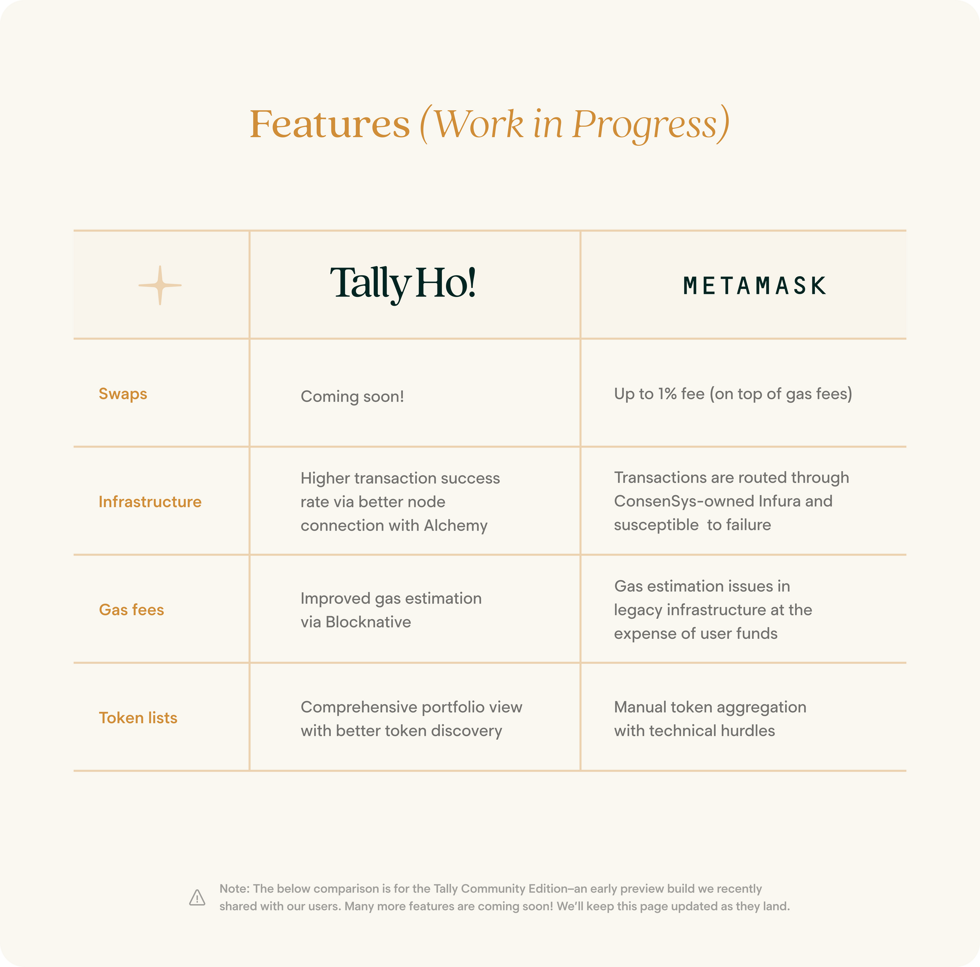 And Tally Ho’s community is open to everyone. We truly appreciate the foundation the original MetaMask team laid back in 2016. But it’s 2022, and your portal to Web3 should be Web3-native, not a Web2 hangover.