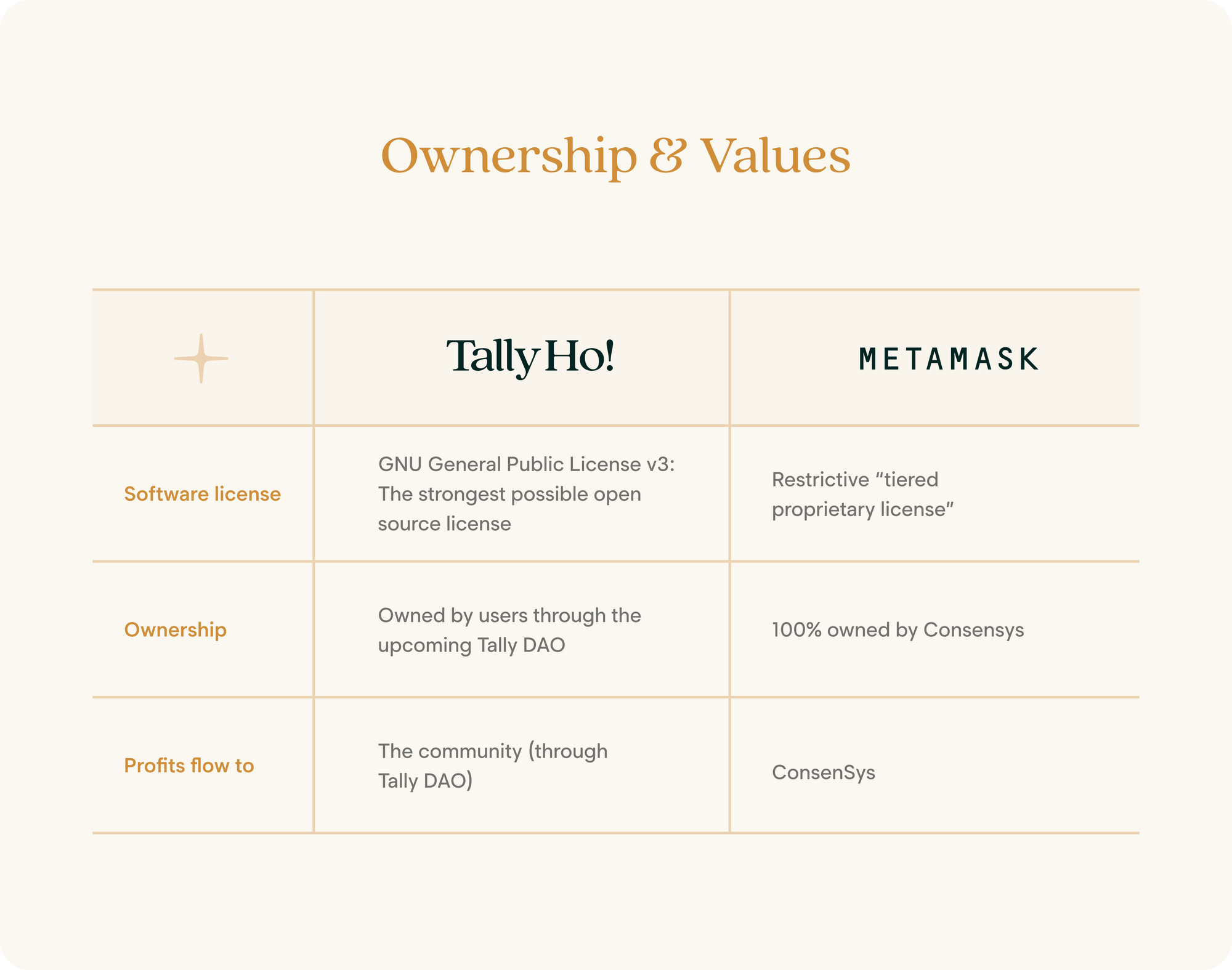 Tally Ho is the first community-owned Web3 wallet. It already has the features you love from MetaMask (plus many more coming soon!), and unlike MetaMask, it’s 100% open source. Most importantly: Tally Ho is owned by its users (not a corporation), and all profits are shared with the community, not siphoned away to shareholders.