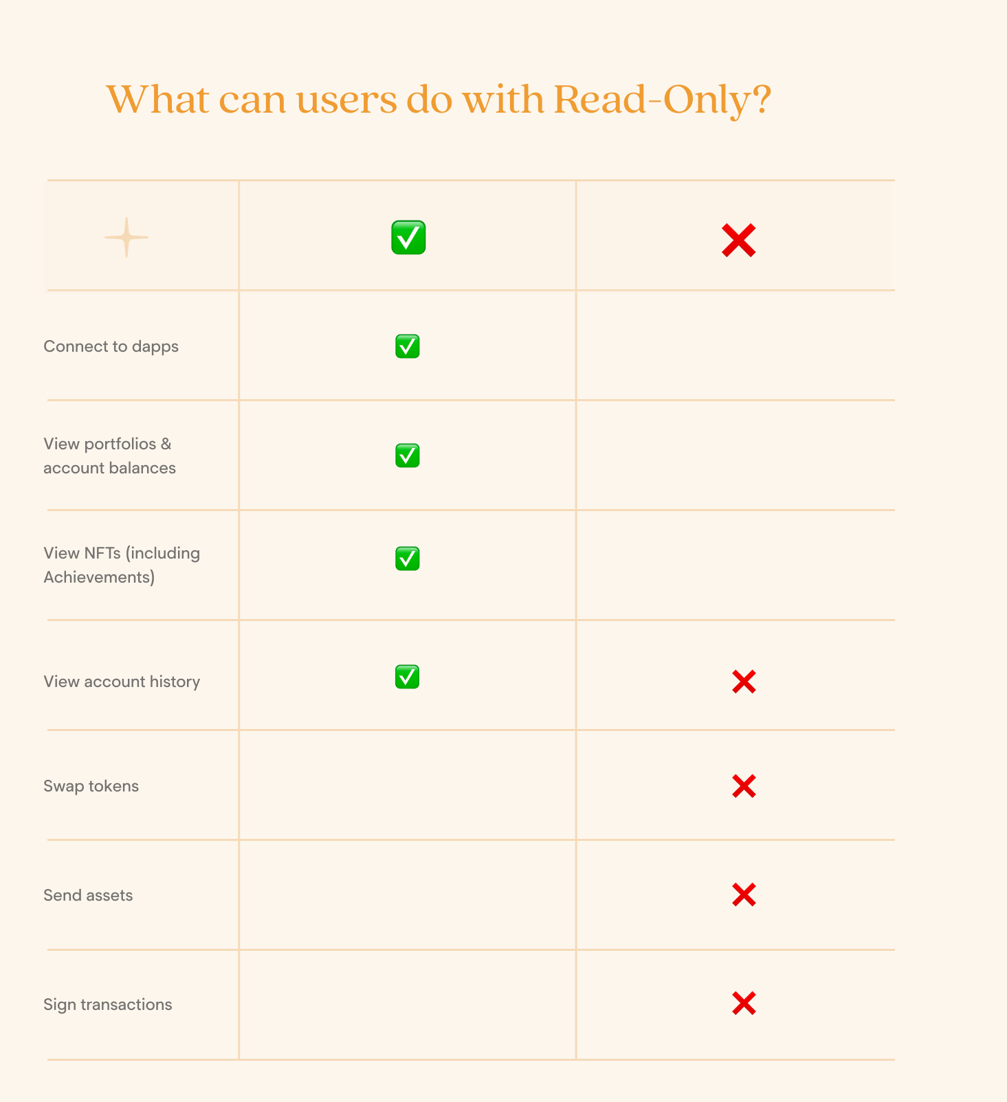 - Read-only also allows you to see a wallet’s NFTs and on-chain achievement tokens (OATs) on all our supported networks.