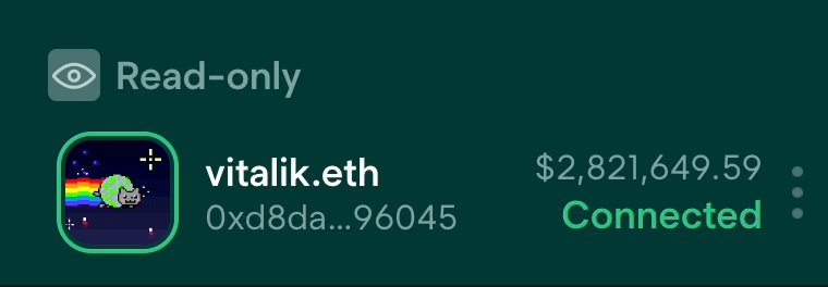 Read-only mode is like web3 window shopping. Not only can you keep track of what’s going on in your own wallet(s), you can (safely) peek into others as well. Try connecting to vitalik.eth.